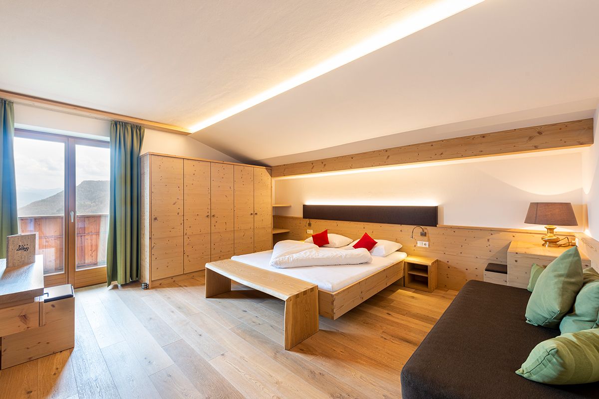 Naturholzboden, hochwertige Naturholz-Einbaumöbel, Wandsafe, Flachbildfernseher mit Sat-TV, Balkon mit Blick ins Tal bis nach Bozen auf die imposante Bergwelt der Dolomiten mit dem rot glühenden Rosengarten, Tisch und Stühle sowie Liegen zum Entspannen, drittes Bett bzw. Babybettchen möglich (max. 4 Personen), Badezimmer mit WC, Dusche und Harrtrockner, Bademäntel und Badeslipper, Kostenloses WLan.