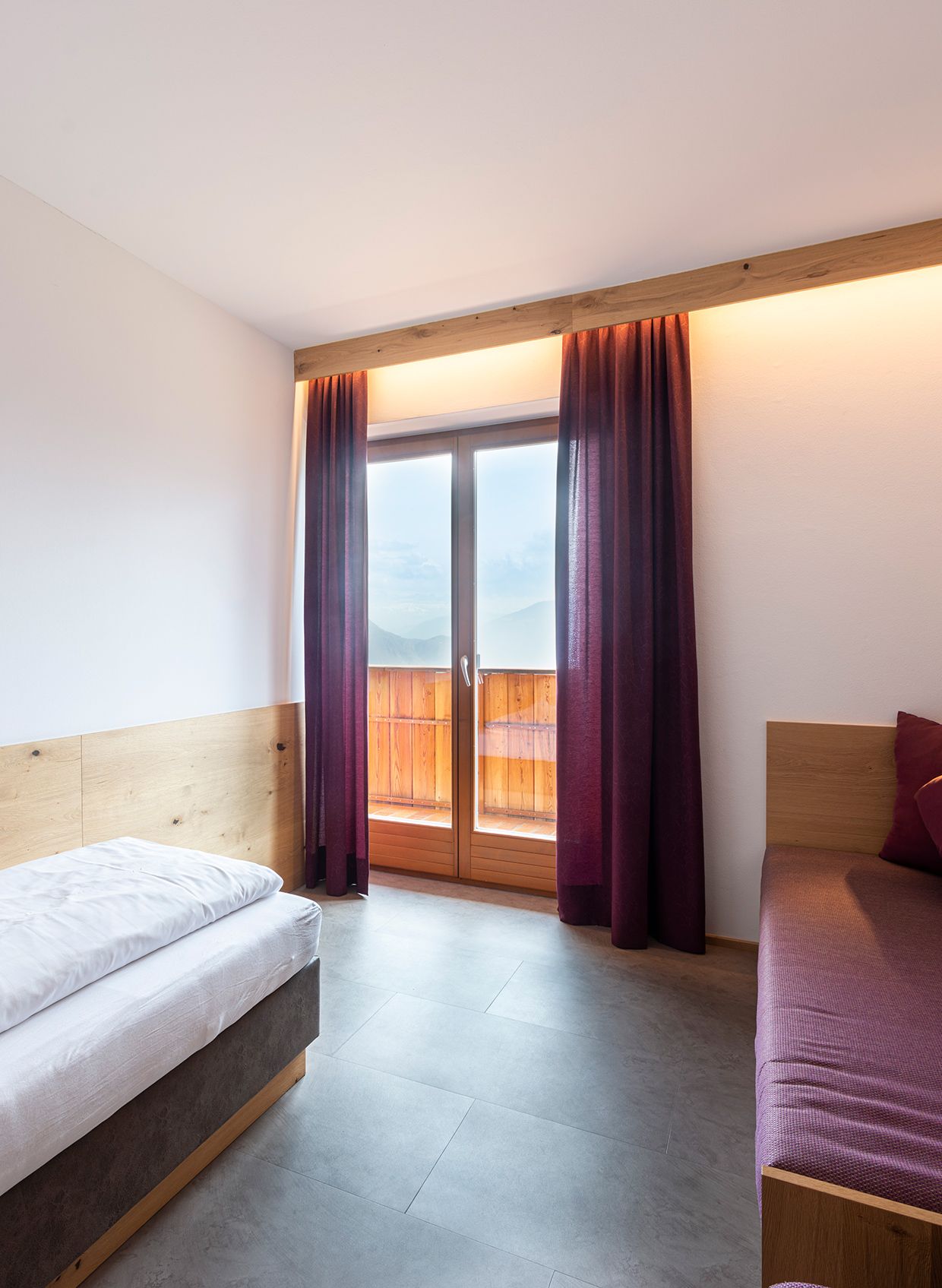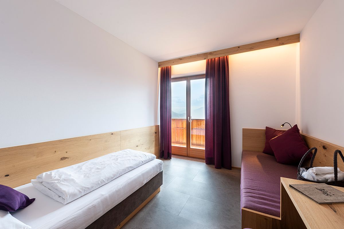 Komplett neues helles Zimmer mit Design-Vinylboden, hochwertige Naturholz Einbaumöbel, gemütliches Einzel-Boxspringbett, gemütliches Sofa mit Leselampe (ev. als zweites Bett nutzbar), Schreibtisch mit Hocker, Flachbildfernseher mit Sat-TV, Balkon mit Blick ins Tal bis nach Bozen und auf die imposante Bergwelt der Dolomiten mit dem rot glühenden Rosengarten, Tisch und Stuhl sowie Liege zum Entspannen, Badezimmer mit WC, Dusche und Haartrockner, Bademantel mit Badeslipper, Kostenlose WLan.