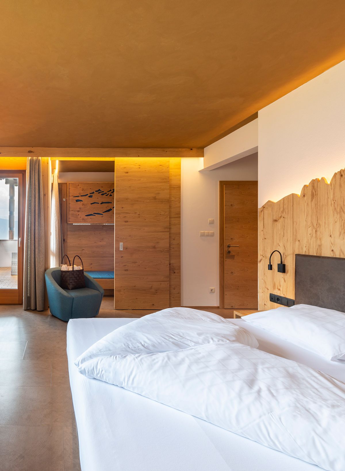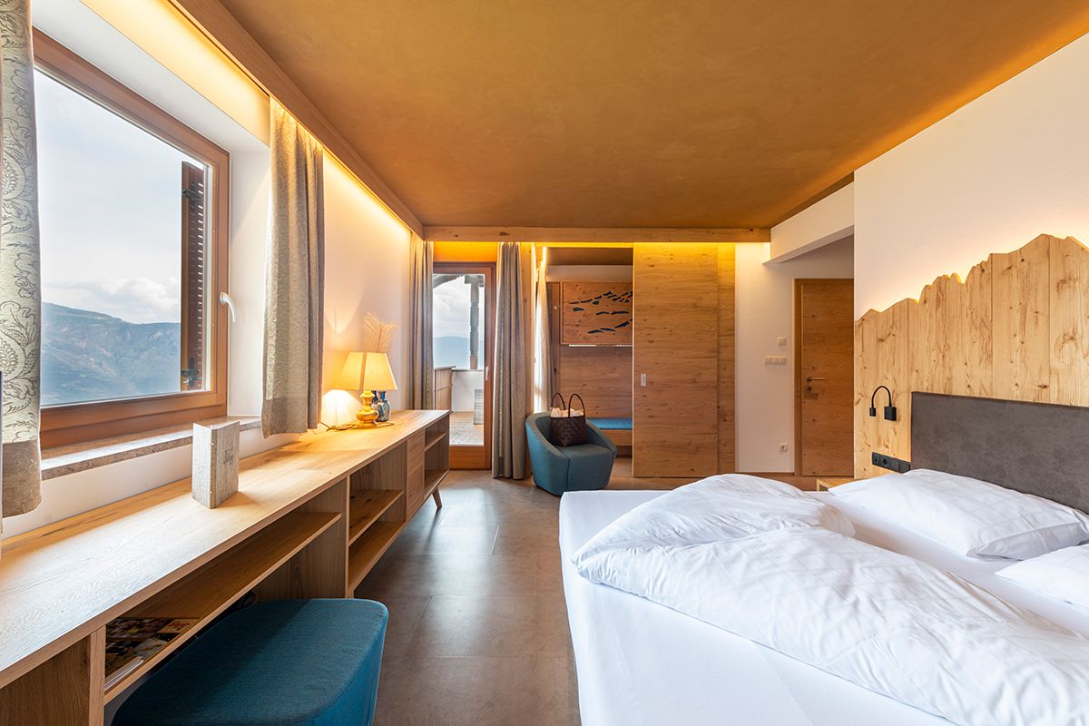Komplett neues helles Zimmer mit Design-Venylboden, hochwertige Naturholz Einbaumöbel, gemütliches Boxspringbett, Wandsafe, Schreibtisch mit Hocker, Flachbildfernseher mit Sat-TV, Süd-Ostbalkon mit Blick ins Tal bis nach Bozen und auf die imposante Bergwelt der Dolomiten mit dem rot glühenden Rosengarten, modernes Rattan-Sofa sowie Liegen zum Entspannen, helles Badezimmer mit Fenster, WC, Dusche und Haartrockner, Bademäntel und Badeslipper, heller abtrennbarer Schlafbereich für max. zwei Kinder (Etagenbett) mit Fenster, kostenloses WLan.