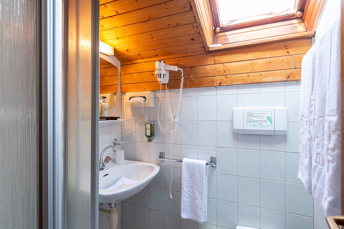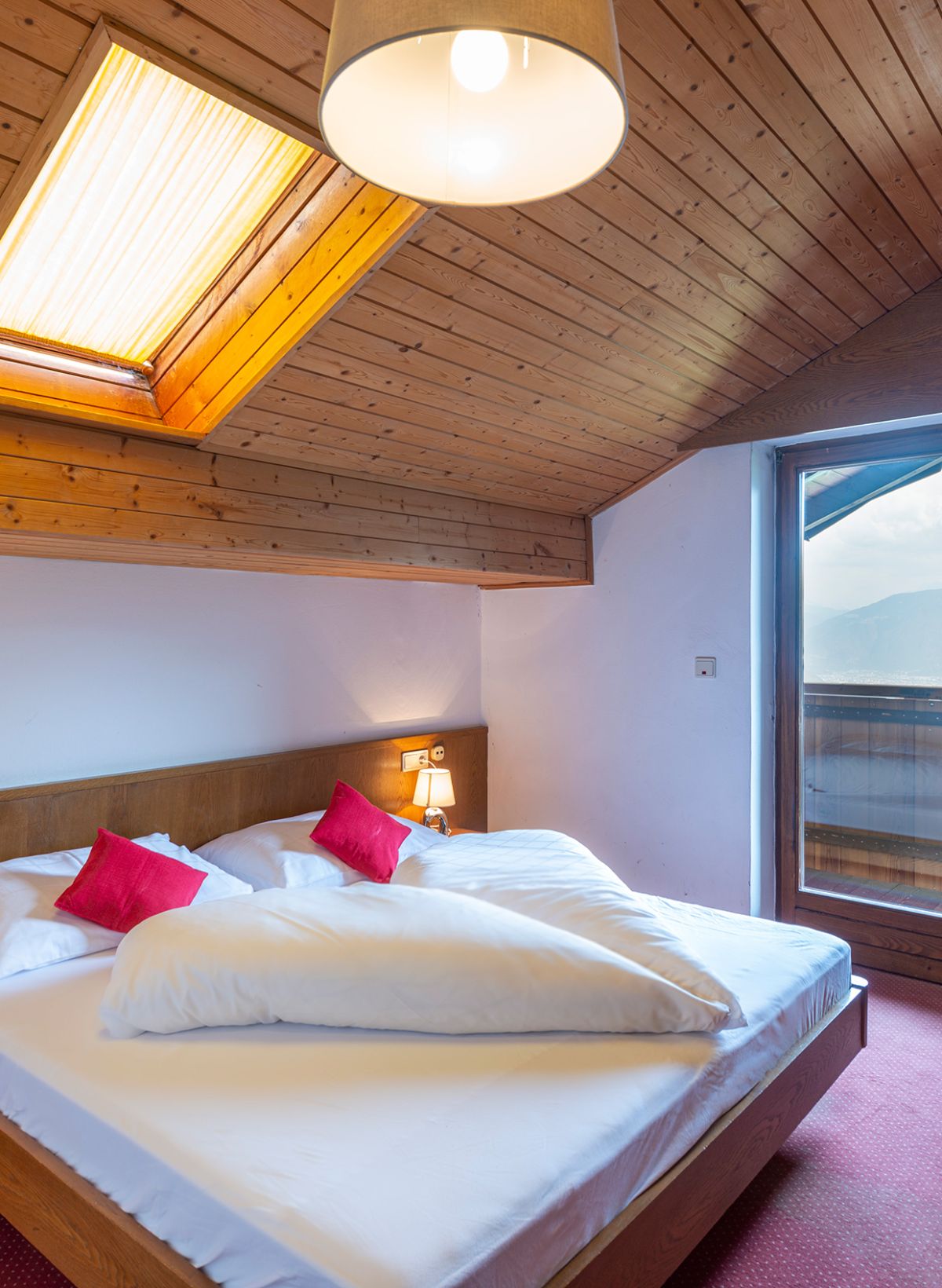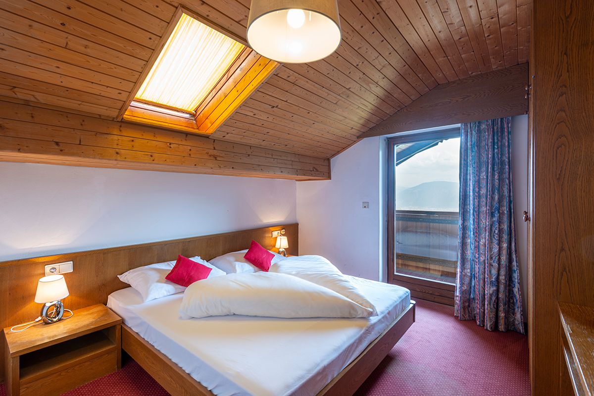 Kleines Dachzimmer mit Doppelbett, Schreibtisch mit Stuhl, Flachbildfernseher mit Sat-TV, Balkon mit atemberaubendem Blick ins Tal bis nach Bozen und auf die imposante Bergwelt der Dolomiten mit dem rot glühenden Rosengarten, Tisch und Stühle, Badezimmer mit WC, Dusche und Haartrockner, Bademantel und Badeslipper, Kostenloses WLan.