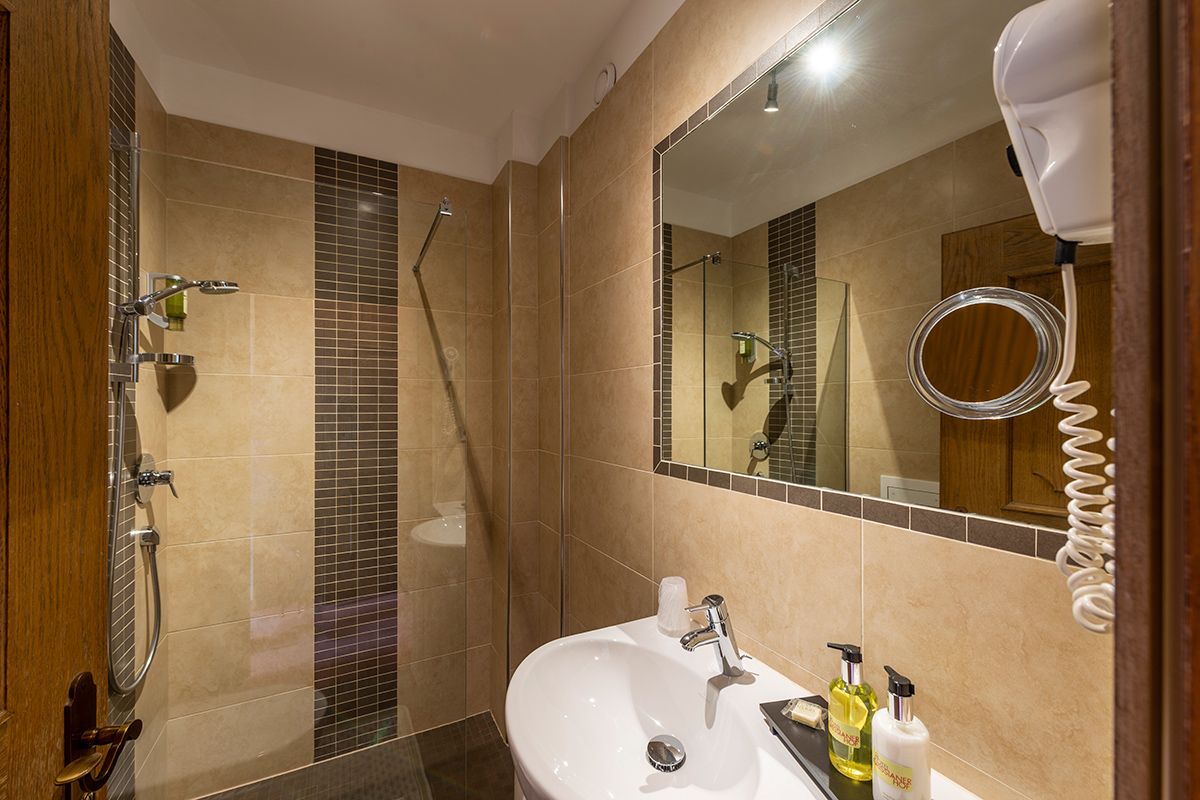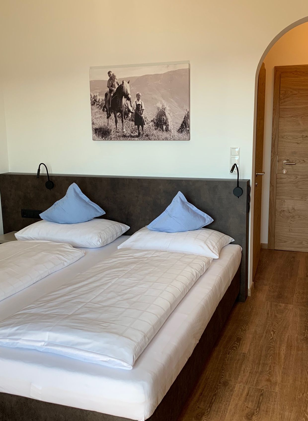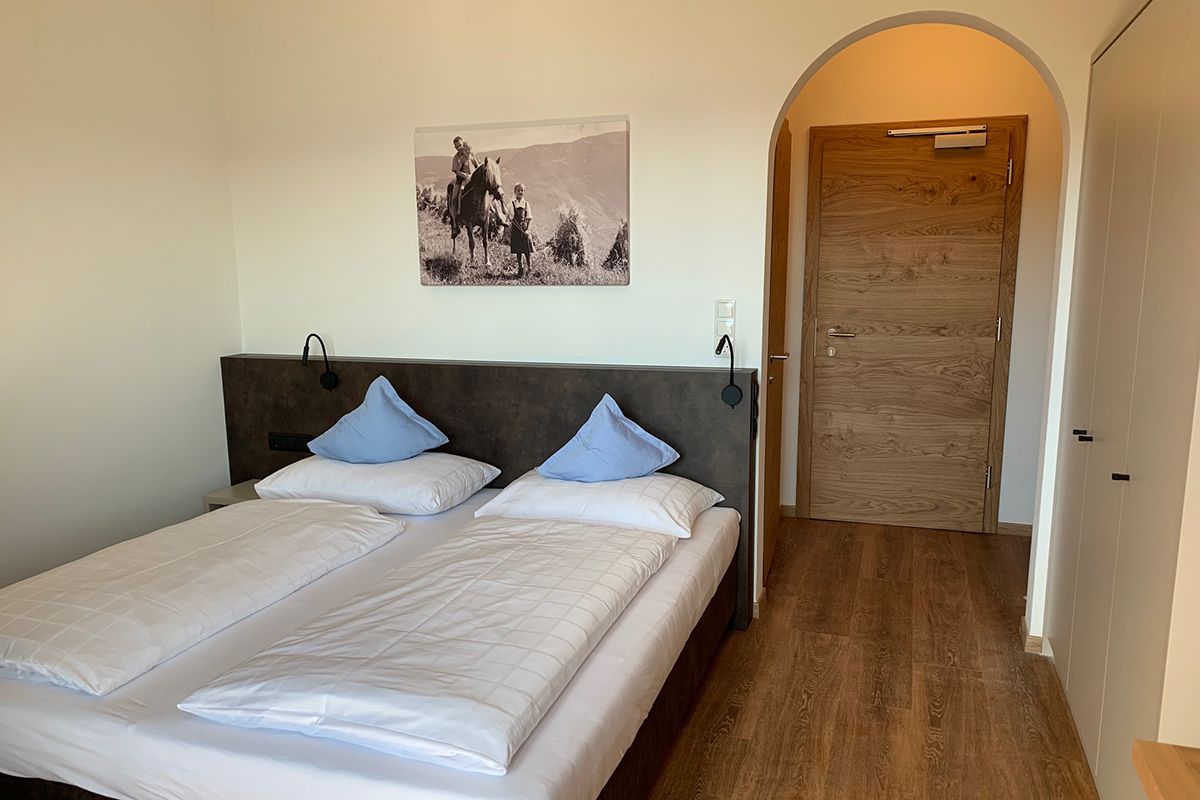 Komplett neues Zimmer mit Holzoptik Designboden, hochwertige Einbaumöbel, gemütliches Boxspringbett, Wandsafe, Tisch aus Kastanienholz mit zwei Stühlen, Flachbildfernseher mit Sat-TV, Balkon mit Blick ins Tal bis nach Bozen und auf die imposante Bergwelt der Dolomiten mit dem rot glühenden Rosengarten, Tisch und Stühle sowie Liegen zum Entspannen, Badezimmer mit WC, Dusche und Haartrockner, Bademäntel und Badeslipper, kostenlos WLan.